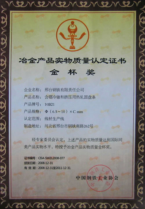 含硼冷鐓和冷擠壓用鋼盤條獲冶金產(chǎn)品實物質量金杯獎