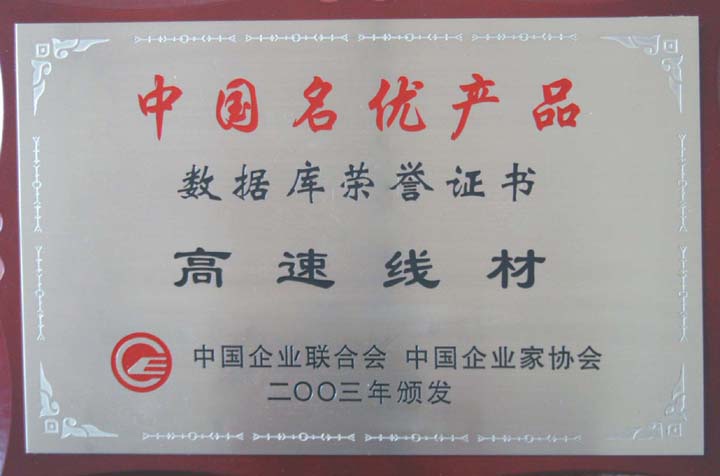 2003年,邢鋼高速線材獲中國(guó)名優(yōu)產(chǎn)品數(shù)據(jù)庫(kù)榮譽(yù)證書。