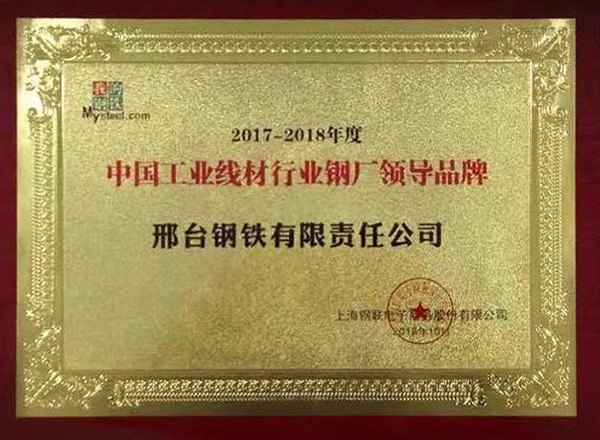 2018年10月22日,在上海舉辦的“2018年Mysteel中國工業(yè)線材暨緊固件產(chǎn)業(yè)鏈高峰論壇”上,論壇評委會根據(jù)對國內(nèi)工業(yè)線材生產(chǎn)鋼廠2017-2018年品牌、質(zhì)量和市場反饋等評比,評選出“中國工業(yè)線材行業(yè)鋼廠領導品牌”,邢鋼獲此殊榮。