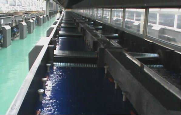 6、鍍銅:屬于堿性鍍銅,分為26線和7+7線,每條線均有21個鍍槽,控制方式為集絲集控和單絲單控, 7+7型為單絲單控,可以同時生產(chǎn)14種規(guī)格和工藝各不相同的鋼絲,每條線的工藝參數(shù)如電流和速度等都可以單獨(dú)控制。而26線為集絲集控,其中26線采用銅粒做為消耗補(bǔ)充,7+7線采用銅板作為消耗補(bǔ)充。