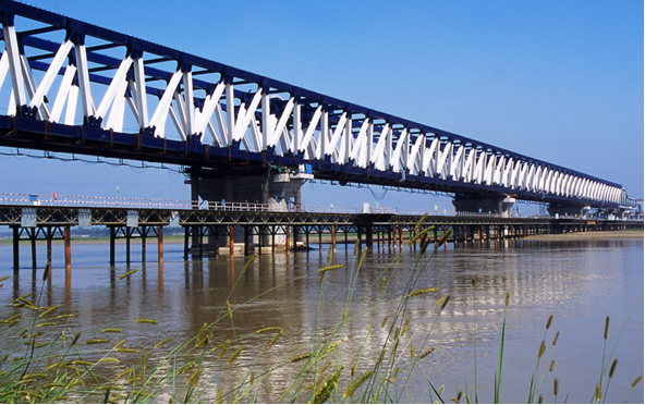 據(jù)中鐵大橋局介紹,鄭州黃河公鐵兩用橋具有四大特點:一是規(guī)模宏大,大橋公鐵合建長度達(dá)到九千一百七十七米,是迄今為止世界上最長的公鐵合建橋梁;二是設(shè)計標(biāo)準(zhǔn)高,橋上火車時速達(dá)到三百五十公里,創(chuàng)下世界特大型橋梁通行速度的新紀(jì)錄;三是結(jié)構(gòu)形式獨(dú)特,鋼梁采用了三主桁倒梯形結(jié)構(gòu),兩邊桁架是斜桁,此結(jié)構(gòu)在世界橋梁建設(shè)中系最先采用;四是施工方法新穎,該橋運(yùn)用了“多點同步頂推”技術(shù),不僅在頂推最大跨度、總長度和總重量方面均創(chuàng)“世界之最”,而且減少了對河道的干擾和環(huán)境的破壞。