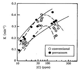 新日鐵名古屋廠的實踐證實,預抽真空可以消除初始階段脫碳速率的滯止,使脫碳速率在RH開始處理后迅速達到高的水平,如下圖所示。預抽真空循環(huán)開始的時間要比沒有預抽縮短0.5min。