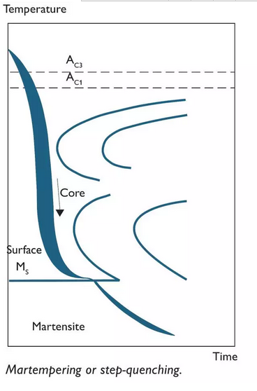 如今,用于合金鋼的淬火介質(zhì)有:硬化油、聚合物溶液、空氣和惰性氣體??諝庥不A粲糜诰哂懈叽阃感缘匿摚@在大多數(shù)情況下主要歸因于錳、鉻和鉬的組合存在于鋼中。通過階梯淬火或者分級淬火可以減少變形和硬化裂紋的風(fēng)險。在該方法中,材料在兩個步驟中淬火。首先,將其從硬化溫度冷卻直到表面的溫度剛好高于Ms溫度。然后必須保溫在那里直到表面和芯之間的溫度均衡。此后,冷卻過程繼續(xù)。這種方法允許芯和表面幾乎同時轉(zhuǎn)變成馬氏體并減少熱應(yīng)力。當(dāng)在真空爐中淬火時,階梯淬火也是可能的。