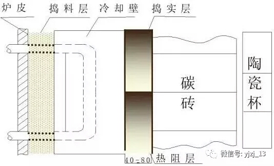 高爐爐缸由外至內通常包括爐皮、搗料層、冷卻壁、搗實層、碳磚、陶瓷杯、黏土磚等,其中,黏土磚在高爐開爐后2個月內脫落。高爐正常生產時爐缸鐵水與爐墻陶瓷杯或碳磚之間生成一層爐渣、鐵水、碳磚、含鈦難融物組成的保護層,這就是我們所說的“高爐爐缸自保護層”。