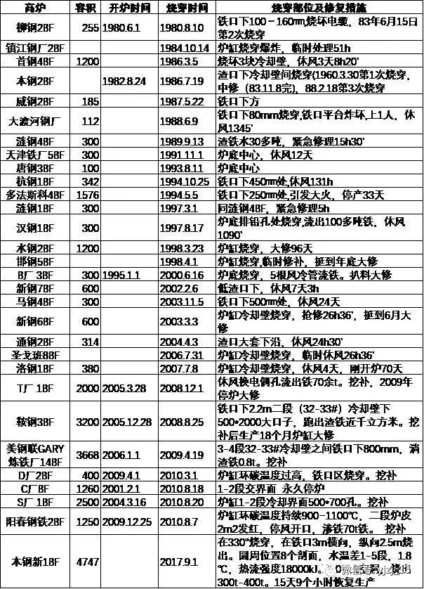 以下針對國內外典型高爐爐缸燒出案例進行統(tǒng)計,并對燒出原因、修復和維護等方面進行詳細的說明,為國內外高爐的長壽提供技術和數(shù)據(jù)參考。