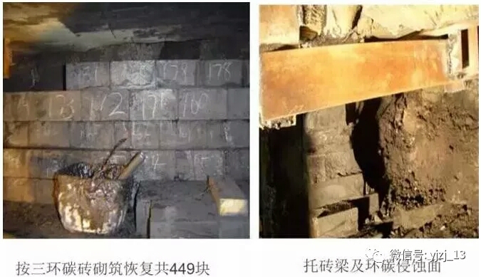 利用工程剩余的UCAR炭磚重新砌筑,部分炭磚需要現(xiàn)場加工外型,縫隙采用炭質泥漿??傆嬈鲋?1層,449塊炭磚。