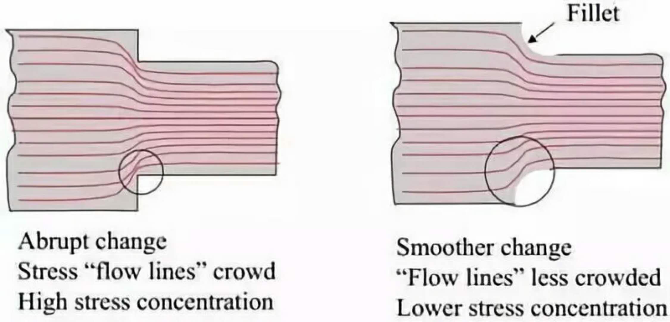 實(shí)際上,所有的疲勞失效都發(fā)生在應(yīng)力集中點(diǎn)或應(yīng)力集中處的零件的外表面上。例如,凹槽、圓角、孔、螺紋、鍵槽、花鍵、焊縫等。如果該部件提供長期無故障的服務(wù),設(shè)計(jì)者必須考慮到這些應(yīng)力提升器的影響。應(yīng)力集中的作用直接與其半徑小有關(guān)。與先前提到的促進(jìn)疲勞失效的微裂紋一樣,應(yīng)力發(fā)生位置的半徑越小,產(chǎn)生的應(yīng)力越集中越大。有趣的是,應(yīng)力集中對(duì)高延展性的金屬影響很小。其解釋是,由幾何變化引起的應(yīng)力集中被限制在屈服應(yīng)力,止于塑性變形。