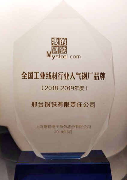 The judging panel selected the "high-quality brand of national industrial wire industry" and "popular brand of national industrial wire industry", which was based on the brand, quality and market feedback of domestic steel mills from 2018 to 2019. Xingtai Steel won these two titles.