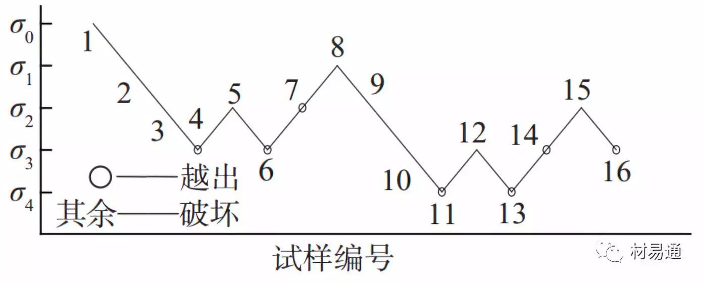試驗(yàn)方法:(1)試驗(yàn)從高于疲勞強(qiáng)度的應(yīng)力水平開始,然后逐級降低(如疲勞強(qiáng)度未知,可選用材料的靜態(tài)拉伸屈服強(qiáng)度Rp0.2或ReL);(2)在應(yīng)力水平下進(jìn)行第一根試驗(yàn),如果在指定壽命N=107次之前發(fā)生破壞,則下一根試樣就要在低一級的應(yīng)力水平下進(jìn)行,反之,則要在高一級的應(yīng)力水平下進(jìn)行,直至完成全部試樣;(3)各級應(yīng)力水平之差叫做“應(yīng)力增量”,在整個試驗(yàn)過程中,應(yīng)力增量應(yīng)保持不變。