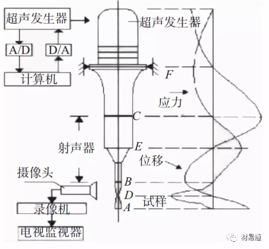 試驗(yàn)裝置主要包括:(1)超聲頻率發(fā)生器(將超聲正弦波電信號由50Hz轉(zhuǎn)變?yōu)?/span>20kHz);(2)壓力陶瓷換能器(將電源提供的電信號轉(zhuǎn)化成機(jī)械振動信號);(3)位移放大器(放大位移振幅使試樣獲得所需的應(yīng)變振幅)。試驗(yàn)裝置原理:由壓電陶瓷換能器、位移放大器和試樣組成的超聲疲勞試驗(yàn)機(jī)構(gòu)成了一個力學(xué)振動系統(tǒng),試樣的加載是由外加信號激勵試樣發(fā)生諧振,在試樣中產(chǎn)生諧振波來實(shí)現(xiàn)。