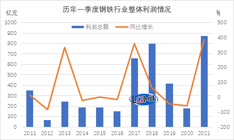 熱點(diǎn)事件:國家統(tǒng)計(jì)局?jǐn)?shù)據(jù)顯示,2021年一季度,黑色金屬冶煉和壓延加工業(yè)實(shí)現(xiàn)營(yíng)業(yè)收入20483.1億元,同比增長(zhǎng)50.5%;營(yíng)業(yè)成本18837.3億元,同比增長(zhǎng)47.7%;實(shí)現(xiàn)利潤(rùn)總額871.4億元,同比增長(zhǎng)387.6%。