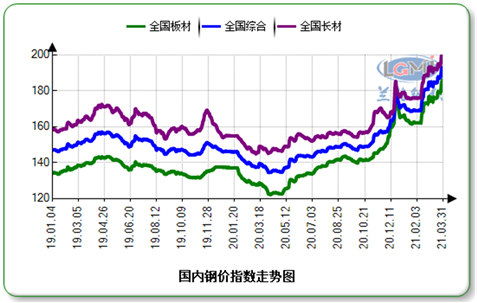 一季度,在需求提振、成本支撐、環(huán)保加碼、國內(nèi)外大宗商品整體上漲帶動(dòng)下,國內(nèi)鋼鐵市場(chǎng)震蕩上行,據(jù)蘭格鋼鐵云商平臺(tái)監(jiān)測(cè)數(shù)據(jù)顯示,一季度,蘭格鋼鐵綜合鋼材價(jià)格指數(shù)均值為177,同比上升22.5%;長(zhǎng)材價(jià)格指數(shù)為184.2,同比上升22.5%;板材價(jià)格指數(shù)為169.7,同比上升29.0%。從鋼材均價(jià)來看,一季度蘭格鋼鐵綜合鋼材均價(jià)為4868元/噸,較上年同期上漲同比上漲977元/噸,同比上漲25.1%。