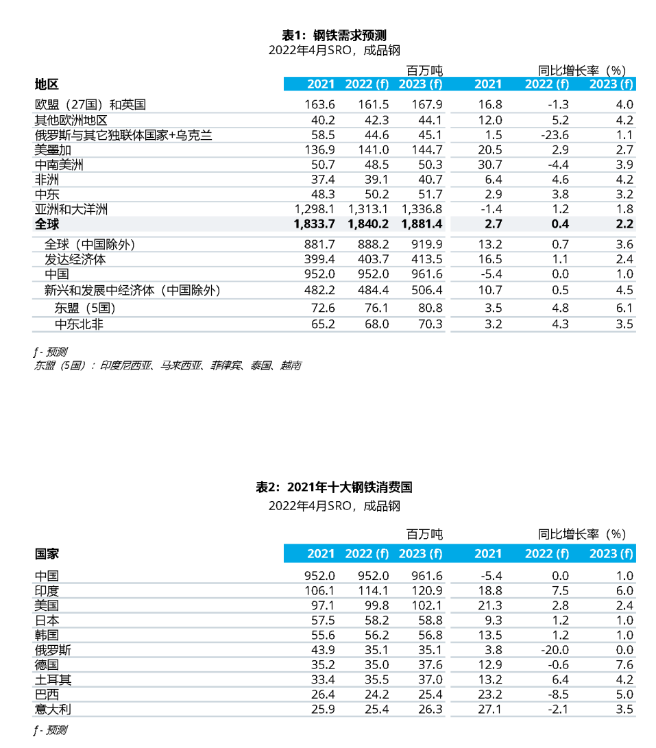 盡管出現(xiàn)零星幾輪疫情和制造業(yè)的供應(yīng)鏈限制,但在2021年鋼鐵需求仍然強(qiáng)勢(shì)復(fù)蘇,特別是在歐盟和美國(guó)。不過,由于通脹壓力,以及圍繞烏克蘭發(fā)生的事件,2022年的鋼鐵需求前景走弱。烏克蘭戰(zhàn)爭(zhēng)的影響在歐盟地區(qū)尤為顯著,原因在于歐盟地區(qū)對(duì)俄羅斯能源的高度依賴以及難民的涌入。在發(fā)達(dá)經(jīng)濟(jì)體,繼2021年鋼鐵需求恢復(fù)16.5%之后,預(yù)計(jì)2022年和2023年鋼鐵需求將分別增長(zhǎng)1.1%和2.4%。