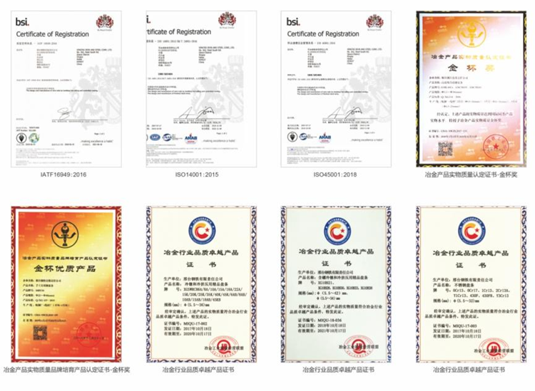 1999年邢鋼開(kāi)始推行質(zhì)量管理體系,成為最早一批通GB/T19000族標(biāo)準(zhǔn)過(guò)認(rèn)證的鋼企之一。2006年,作為全國(guó)首批鋼鐵企業(yè),邢鋼全流程通過(guò)了英標(biāo)認(rèn)證公司TS16949汽車(chē)行業(yè)質(zhì)量管理體系。產(chǎn)品研發(fā)也是芝麻開(kāi)花節(jié)節(jié)高,通過(guò)創(chuàng)新研發(fā)模式相繼開(kāi)發(fā)了汽車(chē)用鋼、鐵路用鋼,高強(qiáng)橋梁用鋼,耐候鋼、重熔鋼等產(chǎn)品,涵蓋冷鐓鋼、彈簧鋼、軸承鋼、純鐵、預(yù)應(yīng)力鋼、易切削鋼、工模具鋼、耐候鋼等十八大系列。如今的邢鋼已經(jīng)通過(guò)EMS,OHSMS等9個(gè)體系認(rèn)證!