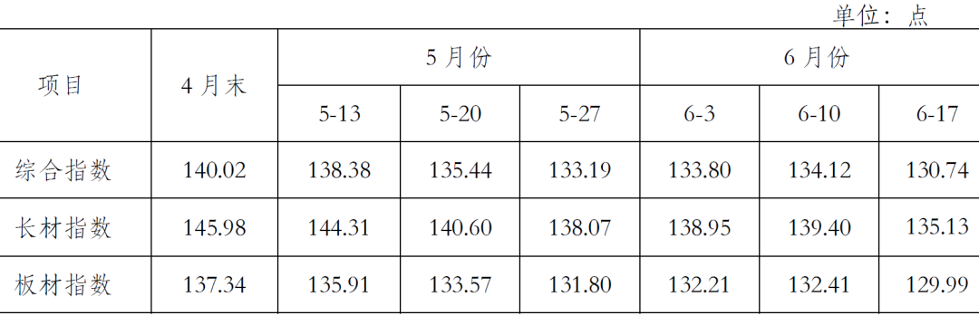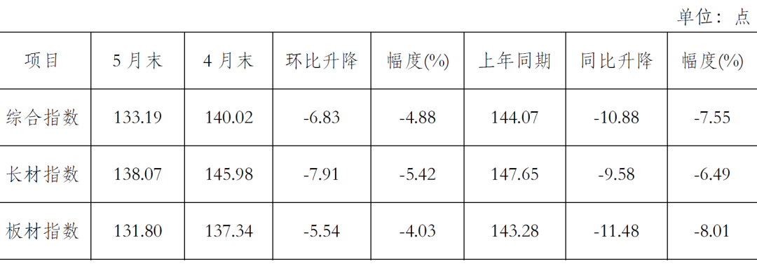 5月末,CSPI長材指數為138.07點,環(huán)比下降7.91點,降幅為5.42%;CSPI板材指數為131.80點,環(huán)比下降5.54點,降幅為4.03%。與上年同期相比,長材、板材指數分別下降9.58點和11.48點,降幅分別為6.49%和8.01%。(見下表)