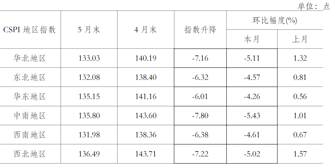 5月份,CSPI全國六大地區(qū)鋼材價格指數均由升轉降。其中中南地區(qū)降幅較大,環(huán)比下降5.43%;華東地區(qū)降幅較小,環(huán)比下降4.26%;華北、東北、西南和西北地區(qū)鋼價指數環(huán)比分別下降5.11%、4.57%、4.61%和5.02%。(見下表)