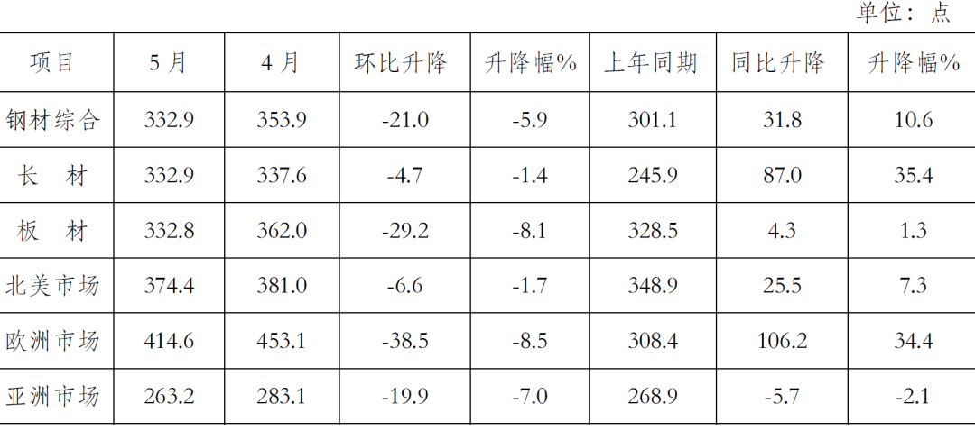 5月份,CRU國際鋼材價格指數為332.9點,環(huán)比下降21.0點,降幅為5.9%;同比上升31.8點,升幅為10.6%。(見下圖)