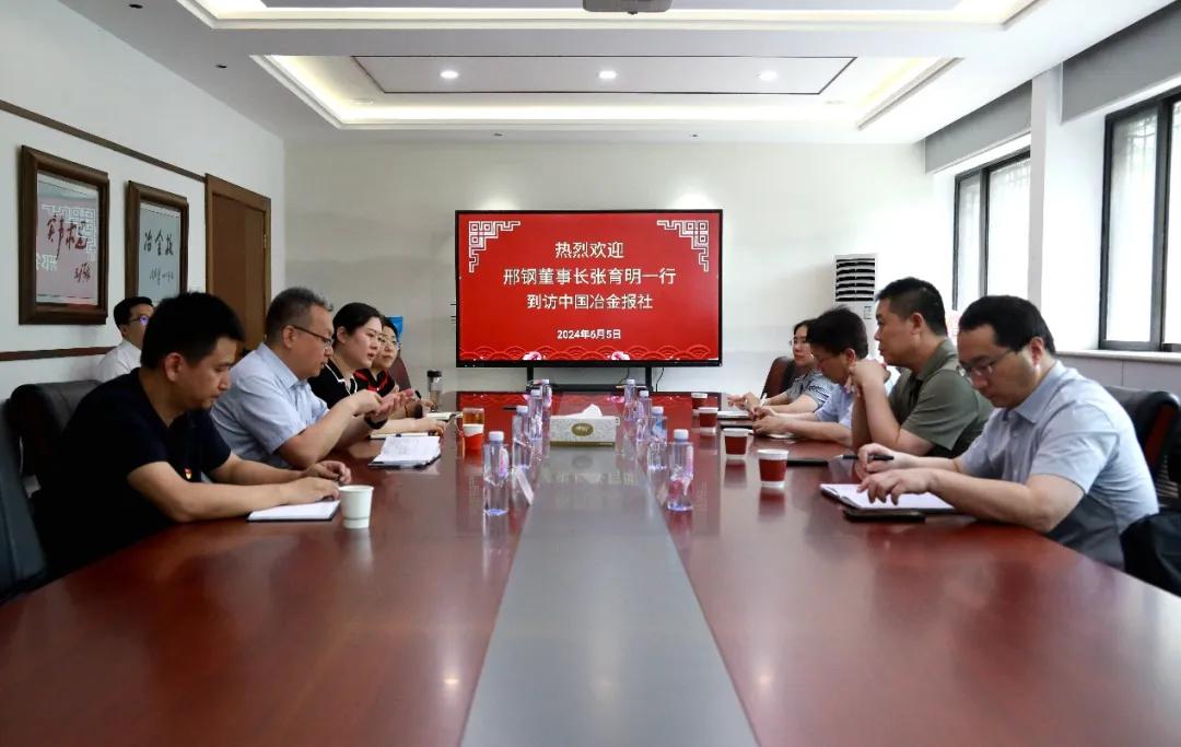6月5日下午,邢臺(tái)鋼鐵有限責(zé)任公司董事長(zhǎng)張育明一行到訪中國(guó)冶金報(bào)社,中國(guó)鋼鐵工業(yè)協(xié)會(huì)副秘書長(zhǎng),中國(guó)冶金報(bào)社黨委書記、社長(zhǎng)范鐵軍熱情歡迎張育明一行的到來(lái),雙方進(jìn)行了座談交流。