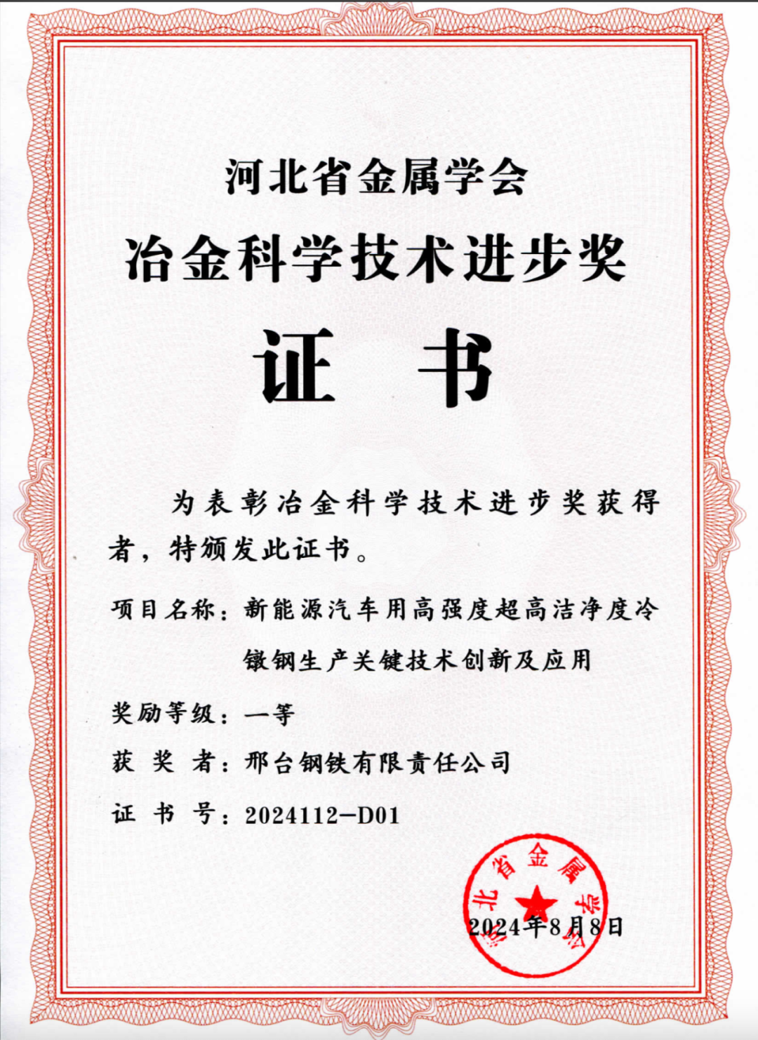 近日,邢臺(tái)鋼鐵有限責(zé)任公司兩項(xiàng)科技成果“新能源汽車用高強(qiáng)度超高潔凈度冷鐓鋼生產(chǎn)關(guān)鍵技術(shù)創(chuàng)新及應(yīng)用”“高品質(zhì)高碳特殊鋼線材夾雜物無害化及均質(zhì)化控制技術(shù)開發(fā)及應(yīng)用”得到河北省金屬學(xué)會(huì)專家評審委員會(huì)的高度認(rèn)可,分別榮獲2024年度 “河北冶金科學(xué)技術(shù)獎(jiǎng)”一、三等獎(jiǎng)。