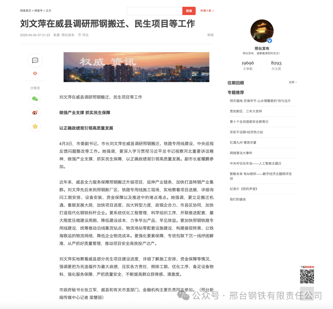4月3日,市委副書記、市長劉文萍在威縣調(diào)研邢鋼搬遷、鐵路專用線建設、中央巡視反饋問題整改等工作。她強調(diào),要深入學習貫徹習近平總書記視察河北重要講話精神,做強產(chǎn)業(yè)支撐,抓實民生保障,以正確政績觀引領高質(zhì)量發(fā)展。副市長崔耀鵬參加。